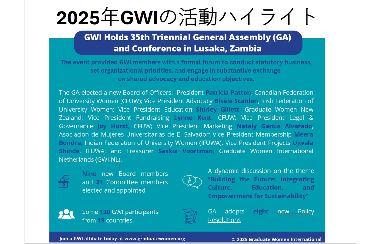 「2025年瞥見」はGWIの1年にわたる活動と重要なマイルストーンの概観を提供し、アドボカシー、教育、ガバナンス、およびコミュニケーションのハイライトをまとめている。それはGWI の国連における持続的な関与、教育プロジェクトおよび奨学金プログラムの実施、ますます多くの会員の参加、ならびにザンビアで開催された第35回トリエンナーレ総会およびコンファレンスの成果を総括する。その発表には、世界中の女性と女児の質の高い教育を受ける権利、ならびにリーダーシップ、平等を享受する権利を擁護して、GWIのグローバル・ネットワークがいかに共有された優先事項を具体的な行動に移したかということについて明確な概略が示されている。それを読むにはここをクリックしてください。